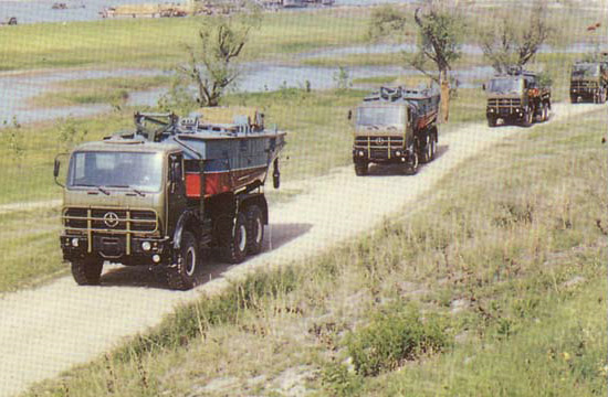 鐵馬XC2200重載卡車(chē)在1980年后期進(jìn)入PLA服役,主要用于運(yùn)輸重型工程設(shè)備和武器系統(tǒng)。中國(guó)鐵馬(Tiema) XC2200重載卡車(chē)由西南汽車(chē)廠(chǎng)(現(xiàn)在北方- 奔馳卡車(chē)公司分部)制造,位于重慶(Chongqing)市。卡車(chē)以德國(guó)梅賽德斯-奔馳2060型卡車(chē)為基礎(chǔ)。目前卡車(chē)在PLA服役中,被當(dāng)做重型工程設(shè)備卡車(chē)和武器系統(tǒng)車(chē)底盤(pán)。PLA在1970年后期訂購(gòu)了少量的德國(guó)梅賽德斯-奔馳2026型重載卡車(chē)(8噸的容量,6X6)補(bǔ)充它不足的重載卡車(chē)。這些卡車(chē)主要地用于重型火炮拖車(chē)任務(wù)。PLA對(duì)車(chē)輛的性能印象深刻,并且接洽梅賽德斯- 奔馳公司去得到許可在中國(guó)聯(lián)合生產(chǎn)卡車(chē)。鐵馬XC2200(最初即是TM-SC2030)的發(fā)展,梅賽德斯- 奔馳2060型的一個(gè)中國(guó)仿造型,從1980年早期開(kāi)始。 西南汽車(chē)廠(chǎng),一個(gè)中國(guó)北方工業(yè)總公司(NORINCO)位于重慶(Chongqing)市的下屬公司,被選擇當(dāng)做主承包商。1982年看到了原型的介紹。稍后在1985年中國(guó)從西德引進(jìn)了ZF機(jī)械變速箱和KHD413風(fēng)冷柴油發(fā)動(dòng)機(jī)技術(shù),兩者在鐵馬XC2200卡車(chē)上被采用。XC2200批量生產(chǎn)在1986年開(kāi)始,每年從生產(chǎn)線(xiàn)上生產(chǎn)2,000輛。大多數(shù)的這些車(chē)輛被PLA接收用于重貨物/設(shè)備運(yùn)輸、火炮拖車(chē)和武器系統(tǒng)車(chē)底盤(pán)。車(chē)輛包括在西藏高地、戈壁沙漠和中國(guó)最?lèi)毫拥牡缆泛吞鞖鉅顩r區(qū)域展示了優(yōu)良性能和可靠性。除了被PLA部署,車(chē)輛也被輸出到巴基斯坦、泰國(guó)、印尼和斯里蘭卡。XC2200采用雙車(chē)門(mén)正向控制駕駛室,位于發(fā)動(dòng)機(jī)艙上面。駕駛室有四個(gè)座位和在頂板有一個(gè)天窗。后面的貨物車(chē)身的后擋板和側(cè)擋板可放下,可拆卸蓬架和帆布蓬。單預(yù)備輪被垂直地安裝在乘員室后面,靠近載貨車(chē)箱在駕駛室和后貨物車(chē)體之間。這一個(gè)空間能用來(lái)容納一個(gè)修理工具箱和其它的裝載/卸貨設(shè)備。與第一代中國(guó)自行生產(chǎn)的重型臺(tái)車(chē)相比較,XC2200有好很多的通用性能,連同85公里/小時(shí)的最大道路速度和一個(gè)8噸的越野裝載能力。ZF5S-110/111 GPA變速箱有九個(gè)前進(jìn)檔和一個(gè)倒車(chē)檔。三個(gè)車(chē)軸和六個(gè)車(chē)輪全部運(yùn)行使用速度差速器鎖定裝置,即使當(dāng)車(chē)輛的一側(cè)上一個(gè)或更多的車(chē)輪沒(méi)有與地面接觸中,或已經(jīng)失去牽引,確保車(chē)輛持續(xù)驅(qū)動(dòng)。除了基本的貨物卡車(chē)改型之外,XC2200也可得到許多其它的改型, 包括4X4、8X8、長(zhǎng)軸距貨車(chē)、起重機(jī)、掩護(hù)所、架橋車(chē)、運(yùn)船車(chē)、道路鋪設(shè)車(chē)和多種武器系統(tǒng)車(chē)底盤(pán)。中國(guó)也已經(jīng)發(fā)展基于XC2200設(shè)計(jì)的WZ551輪式裝甲人員輸送車(chē)(APC)。鐵馬XC2200浮橋架橋卡車(chē)。鐵馬XC2200用于WS-1多管火箭發(fā)射裝置車(chē)底盤(pán)。鐵馬XC2200用于運(yùn)船車(chē)。