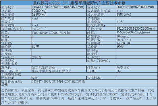 鐵馬牌XC2300型越野載貨汽車(chē)由重慶北奔汽車(chē)有限公司依據(jù)標(biāo)準(zhǔn)生產(chǎn)制造,發(fā)動(dòng)機(jī)選用重慶北奔汽車(chē)有限公司生產(chǎn)的M11-C350E20發(fā)動(dòng)機(jī),發(fā)動(dòng)機(jī)排量為10800CC,發(fā)動(dòng)機(jī)功率為261千瓦,整車(chē)總質(zhì)量30000千克,整備質(zhì)量13800千克,最高車(chē)速可達(dá)90公里/小時(shí),可載客人,該產(chǎn)品公布于工信部汽車(chē)公告第99批次。