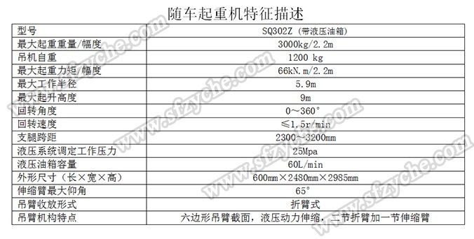 凈功率206kw; 起重機(jī)型號為:SQ302Z(帶液壓油箱),起重機(jī)質(zhì)量為:1200kg,最大額定超升載荷為:3000kg. 側(cè)防護(hù)金屬材料Q235斷面槽形,螺栓連接,斷面高度40mm,離地高度450mm; 后防護(hù)金屬材料Q235斷面槽形,螺栓連接,斷面高度135mm,離地高度500mm; 安裝具有衛(wèi)星定位功能行駛記錄儀,東風(fēng)越野隨車吊:www.tsjljd.com 吊機(jī)詳細(xì)參數(shù):