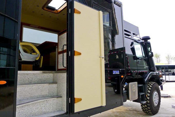 六驅(qū)越野房車底盤配置:Zetros6×6采用了14.00 R20的鋼制越野輪胎,如果用戶認(rèn)為這款輪胎尺寸太大,那么奔馳還提供小尺寸的10.00 R20輪胎選裝。對(duì)于要求個(gè)性化的用戶,奔馳還為Zetros的輪胎準(zhǔn)備了拋光的輪轂罩。Zetros雖然沒有采用烏尼莫克的招牌門式橋結(jié)構(gòu),但其前后的拋物線鋼板彈簧依然能夠保證越野時(shí)的車身承重與舒適性。這款車前后車橋都是輪邊減速橋,后橋速比為4.833。此外其前橋軸間承載極限是9噸,后橋則為18噸,整車最大總重為27噸,匹配全時(shí)6驅(qū)和輪胎充放氣系統(tǒng)成就了它重載越野之王的稱號(hào)。一副正統(tǒng)卡車駕駛席的模樣,殊不知后排有著超豪華的裝潢。德國(guó)沃爾特工廠的精細(xì)裝配工藝在這輛卡車上仍然可以體現(xiàn)出來(lái),主副駕駛席氣墊座椅、可加熱電動(dòng)外后視鏡也都是標(biāo)配。Zetros的心臟目前只有一臺(tái)7.2升的奔馳OM 926LA直列6缸渦輪增壓柴油發(fā)動(dòng)機(jī),采用的SCR技術(shù)可以讓其達(dá)到歐5排放標(biāo)準(zhǔn),最大馬力為326馬力,最大扭矩則為1300牛米。變速箱采用的是奔馳公司的G 131型9擋手動(dòng)變速箱,對(duì)于特殊需求的用戶,Zetros也可以選裝自動(dòng)變速箱。在控制面板上你可以很輕松的找到相應(yīng)功能的控制按鈕,圖中中間部分最右側(cè)的是一個(gè)上坡攀爬系統(tǒng)旋鈕,其功效與低扭放大作用一樣,之后向左的第二個(gè)旋鈕可控制三軸之間差速鎖的開合,其形式與奔馳G63AMG 6×6的控制原理一致,三個(gè)擋位控制五把鎖 。